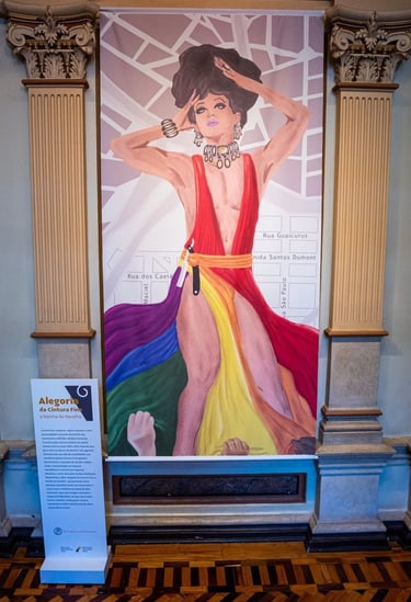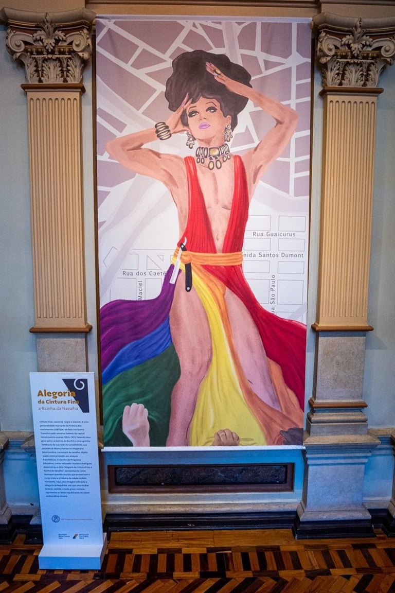 Cintura Fina, cearense, negra e travesti, é uma personalidade marcante da história dos movimentos LGBTQIA+ de Belo Horizonte. Transitou pelo universo boêmio da capital mineira entre os anos 1950 e 1970, fazia seus giros entre os bairros do Bonfim e da Lagoinha. Defensora da sua rede de sociabilidade, sua resistência deixou marcas no imaginário belorizontino, a exemplo da navalha, objeto usado como proteção aos ataques transfóbicos. A convite do Programa Educativo, o arte-educador Gustavo Rodrigues*, desenvolveu a obra Alegoria da Cintura Fina: a rainha da navalha, apresentando como destaque questões sociais que atravessam o corpo trans e a história da cidade de Belo Horizonte. Aqui, essa imagem sobrepõe a Alegoria da República, onde uma mulher branca vestida à moda greco-romana, representa as ideias republicanas da classe aristocrática mineira.